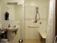 There was a small ramp to get in to bathroom.  The shower was not ideal.  There was a drop-down seat, but there was a rail along the back.  So I'm sitting on the seat with a rail at my back, making it a bit uncomfortable to stay on seat.  The shower was on my left and the shower gel and shampoo on my right, both sort of behind me.  The drainage was good with a drain around the shower area so water did not go into the rest of the bathroom.  I have good core strength so I would suggest if you don't have that strength, you need a shower chair (plastic chair) for safety.